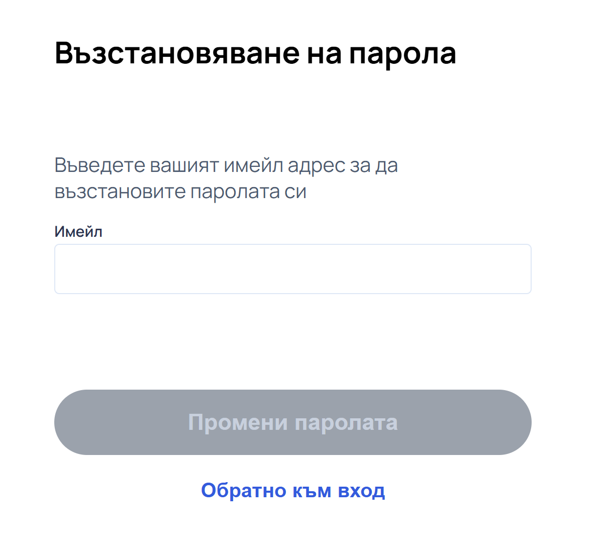При забравена парола, използвайте бутона [забравена парола]. Ще се отвори нов екран, на който можете да въведете вашия имейл адрес, на който ще получите линк за нова парола.