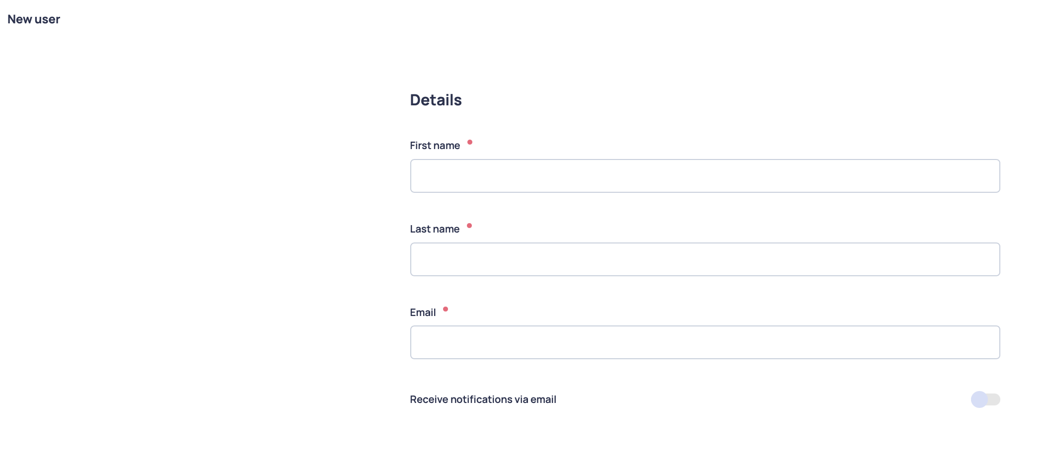 A new profile is created by clicking the "New User" button, filling in the user's details such as first and last name, a valid email address, and whether the user should receive messages from the system at the specified email address.